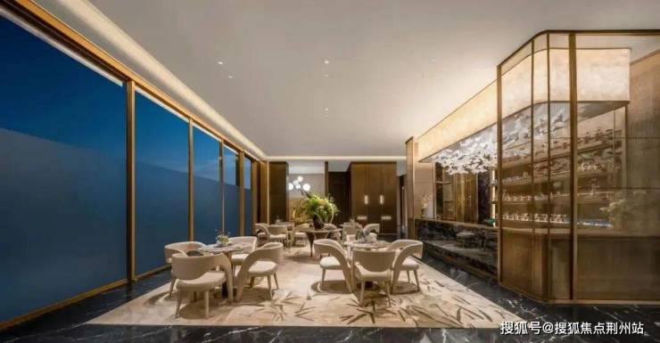 踱步向前,便是约500㎡的【晓月序厅】生活美学馆。入口以"明月松间照、清泉石上流"为意境,巧妙构建起城市与社区的边界,区隔喧嚣,回归自然静谧与休闲。空间内,双月造型的金属格栅,彰显绿城匠心工艺;挪威进口的蓝珍珠石材,作为室内装饰主材质,独特的自然纹理,塑造出优雅尊崇的空间格调。