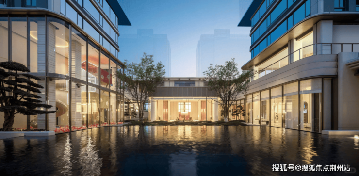 星宜嘉映府对高端生活的理解,始于归家的第一步。社区主入口以伦敦梅费尔瑰丽酒店为设计原型,打造了气势恢宏的酒店式门仪:约200米宽、近7米高的檐口,由16根柱廊构成序列,形成极强的仪式感和昭示性。入口上方的“明瓦灯笼”光影艺术装置,以金色雨棚衔接玉石透光材质,下方映照粼粼水景,将归家瞬间点亮为一场艺术邂逅。