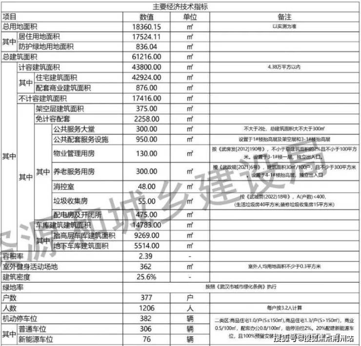 根据项目规划公示数据,地块总占地面积约18360㎡,计容建筑面积约43800㎡,其中住宅建面约42924㎡。项目规划总户数377户,户均面积约113.86㎡,容积率低至2.39,配备机动车停车位382个。