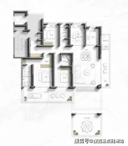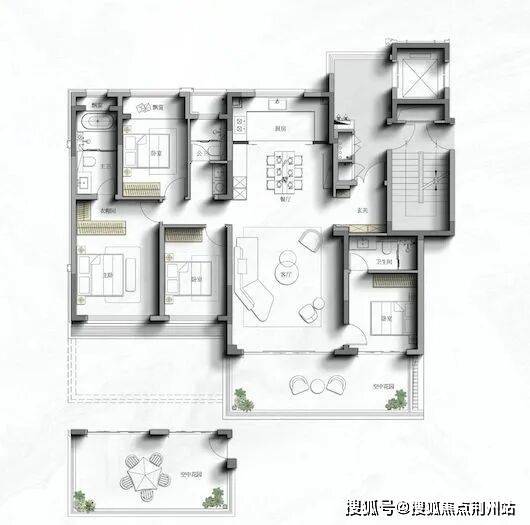 项目中的四代洋房户型,设计了“错层双花园”系统:偶数层配备南向私密花园直连主卧,奇数层则设置社交花园衔接客厅。
