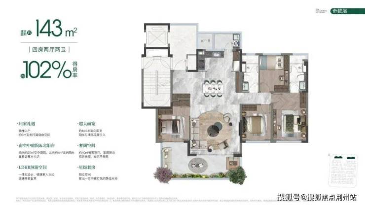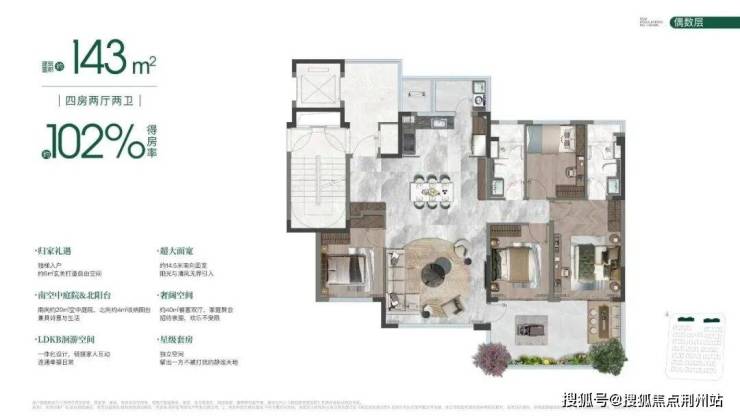 目前143㎡洋房户型已公示,精装交付,分奇、偶数层,区别主要在于空中庭院。