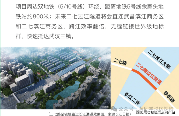 📍地理位置优越:落子武昌滨江商务区杨园片,与二七滨江商务区隔江相望,长江对岸就是武汉陆家嘴三件套(国华金融中心、泰康金融中心、周大福金融中心)。二七路过江通道正从武汉城建·江南岸旁下穿,对岸出口在周大福金融中心附近,从地理位置和经济定位来看,这条过江隧道就是二七滨江的中轴线,也是连接二七滨江与武昌滨江的价值枢纽,如果修通预计十分钟内就到到周大福中心。