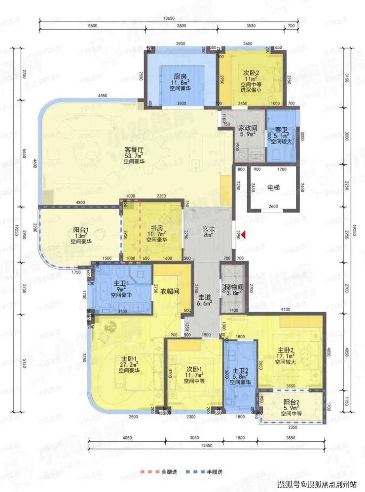 ❷建筑面积约288㎡户型,5房2厅5卫,含赠送得房率约91%。