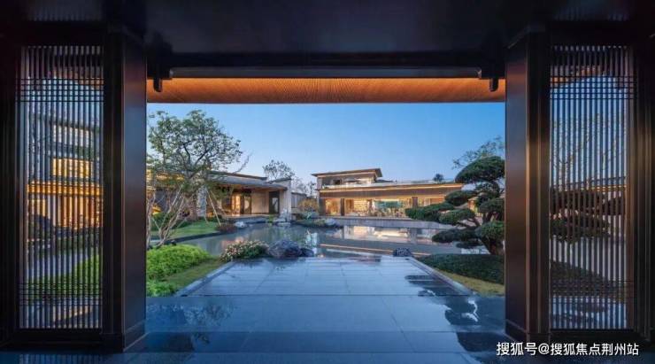 宽约46米、高约8米(含两侧景墙)的禅境新中式门头气宇轩昂。两侧对称布置照壁、石狮子和罗汉松,充满着东方大宅的威仪。