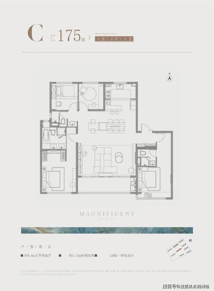 户型:主力户型为128㎡、143㎡、175㎡,以四叶草布局的175㎡大平层为主推户型,四房三卫设计,层高3.15米,客厅开间6.6米。
