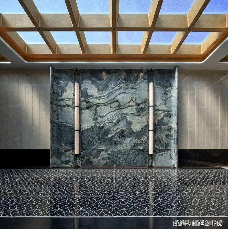 进入大门,就是未来的小区入户大堂,首先映入眼帘的是精选的背景墙,采用的是奢石“万象山河”:它的纹理独一无二、自带磅礴气势,市面上能达到这种尺寸与纹理质感的奢石十分稀缺,以“包罗自然万象”为理念,强调天然美学,多运用在高端酒店大堂内