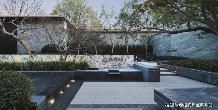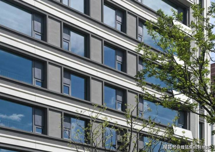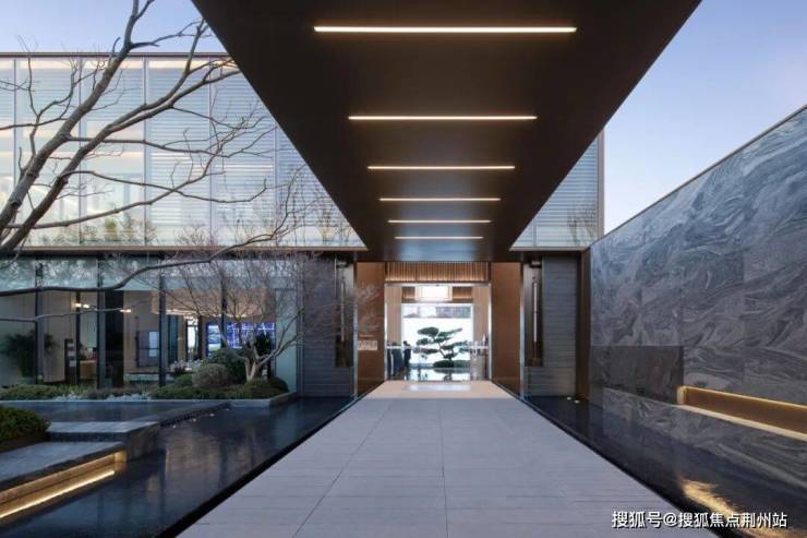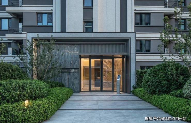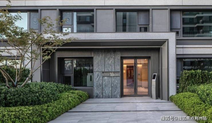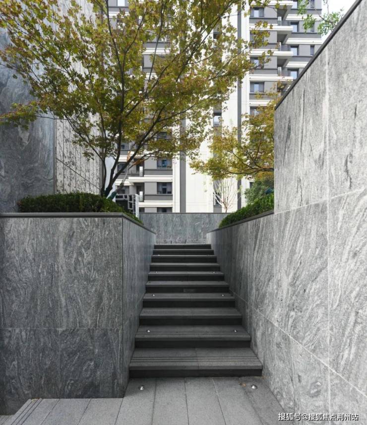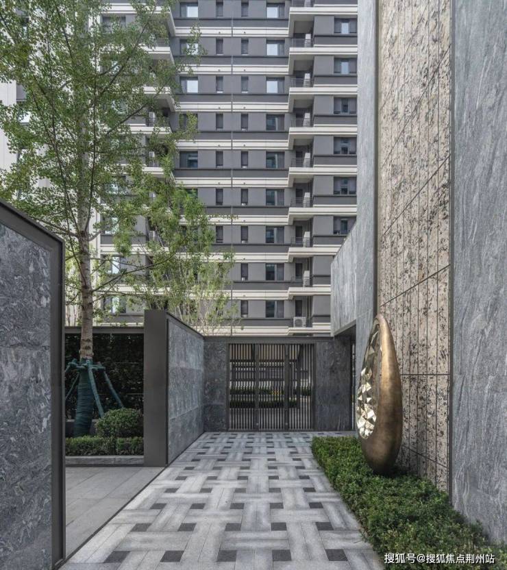 单元入口材质上采用山东白麻及灰色铝板作为主体材料,景观墙选用库班绿石材以错缝方式排布,嵌以金属凹槽,品质独特细节精美。在细节处理上,石材中间不打胶,采用金属嵌条,细节更精致。