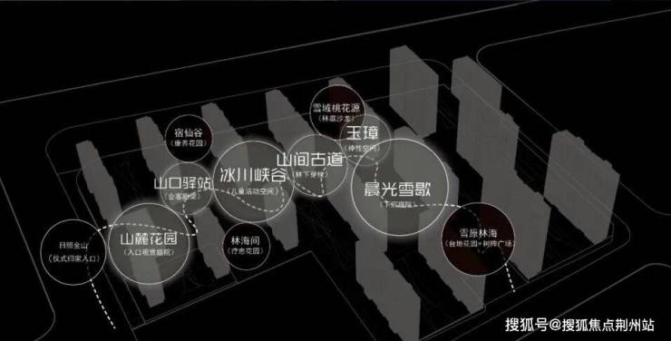 设计结合地块的高差变化,植入自然山水意境塑造多重院落景观,大空间小场景互融取胜。山麓花园、山口驿站、冰川峡谷等不同主题空间的设置,建筑与绿化界面在不同的高度上相互穿插,高低错落,层次丰富。