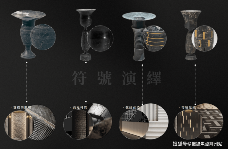 在整体空间意向的提取上,通过多方案的比较,在济南传统的山、泉意向中选择了更具特点的龙山文化黑陶作为主要的故事线。其中,代表当时最高工艺的蛋壳陶,厚度仅0.2mm,展现了精巧的技术水平及审美趣味,方案在图案材料肌理的选取上有诸多的呼应。