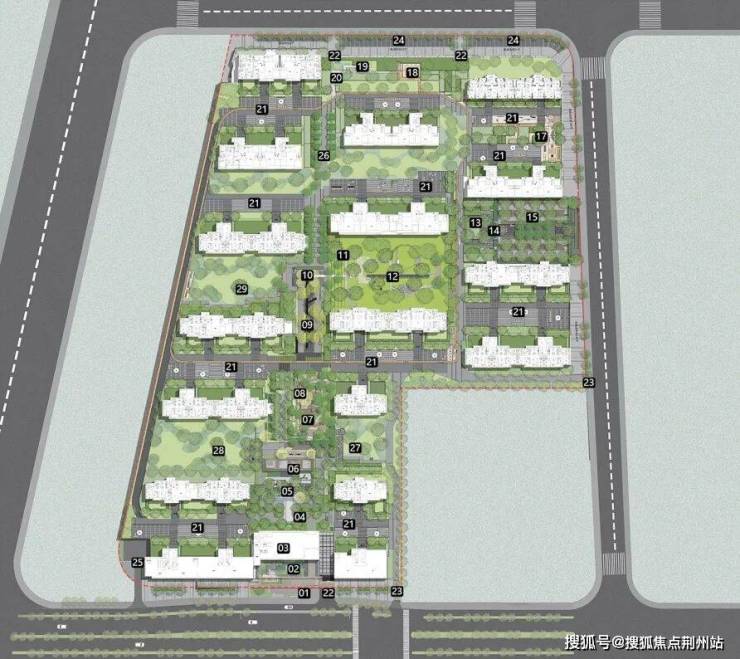 规划设计采用守正用奇的策略,正南北布局,空间收分有度,保证景观资源的均好性。设计突破常规做法,利用场地高差,北侧和东侧住宅内收,塑造为高品质的开放街区,提高片区的商业活力。