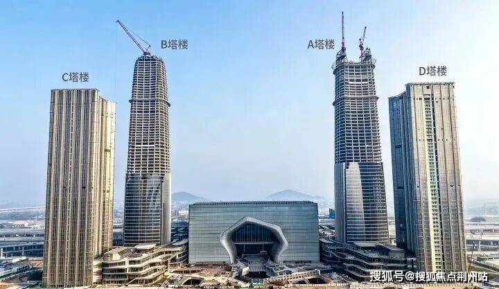 云门中心,A塔楼结构高度达到301 米,云门之眼塔冠即将呈现,B塔楼已封顶,顶部钢结构安装中,C、D 塔楼外立面幕墙完成 90%,室内装修中;