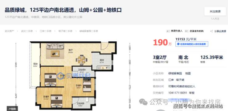 🏠面积125平,挂190万,(价格可谈)三房二厅二卫,单价15000多。小区还有几套同户型的房源。目前这个房子是小区同户型最便宜的。也有其它楼层可以对比。 预算在190万左右这个房子必看。