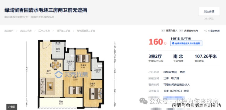 🏠面积107平,挂160万,(价格可谈)三房二厅二卫,单价14000多。小区还有几套同户型的房源。目前这个房子是小区同户型最便宜的。也有其它楼层可以对比。 预算在160万左右这个房子必看。