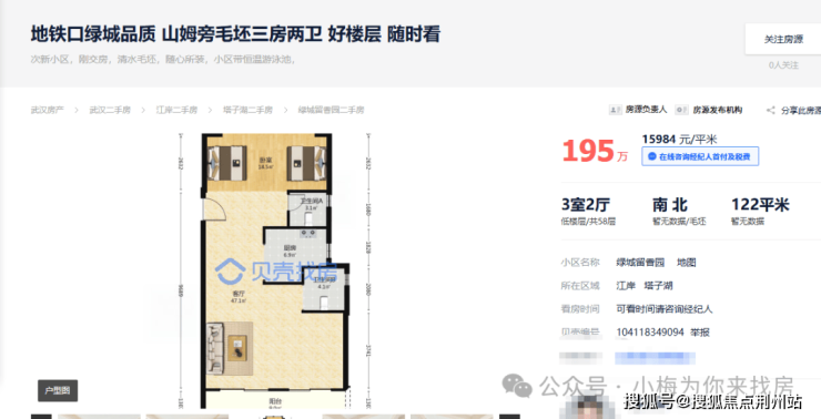 买房须知该小区绿城留香园位于江岸区青松路与夏鹃街交汇处(杨汊湖地铁站B口步行260米)。如果感兴趣可以联系下梅来实地看看房子。因为小梅更新的是二手房,所以房源也会不定期更新,随时也会出现房东急卖房源,如果在江岸区想买房。不妨和小梅聊聊加个小梅微信。小梅会给您客观具体的建议。另可不买,也不要买错。