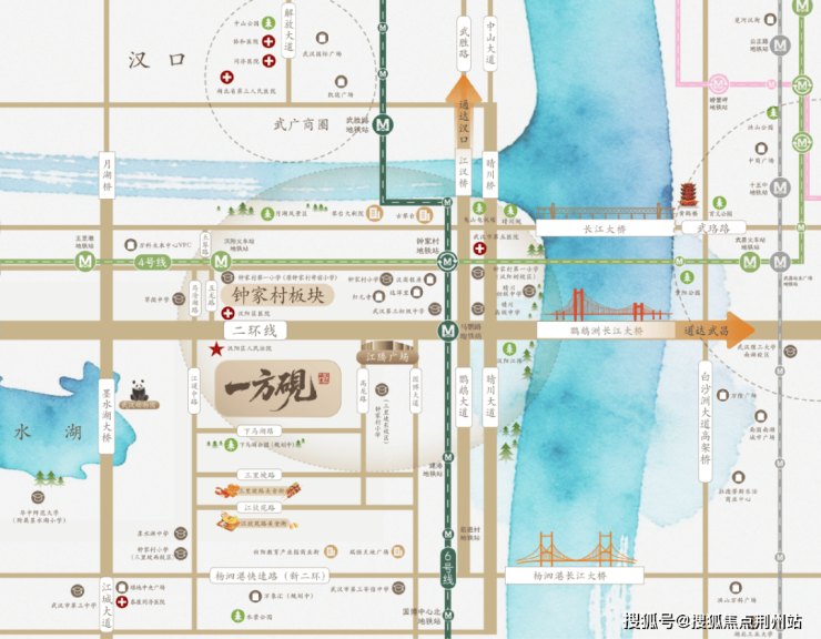 自驾:项目拥有三横(二环线、汉阳大道、杨泗港快速路)三纵(鹦鹉大道、江城大道、晴川大道)的立体交通路网,可快速接驳武汉三镇。
