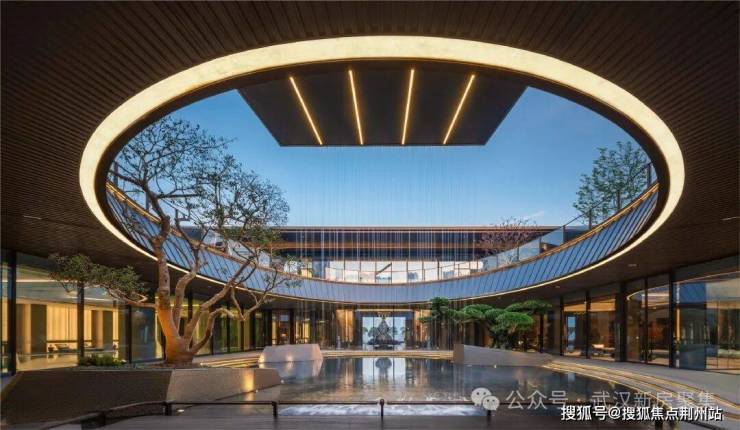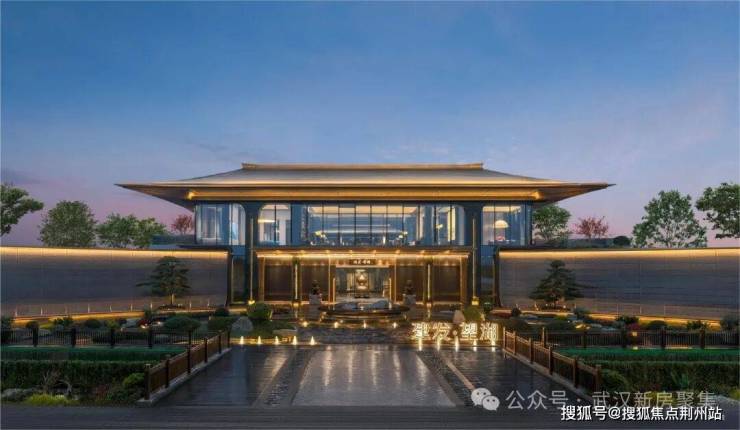 承袭中国传统建筑至高礼制,以当代技法形制庑殿顶,卓立近83米府门威仪;日本进口百年名松,象征基业长青;匠造垂麟铜门,护佑尊荣福气;地面云纹石材,寓意平步青云;手工雕刻宝瓶葫芦艺术装置,将《江汉揽胜图》的繁盛风貌镌刻其上,重现武汉千年风雅。