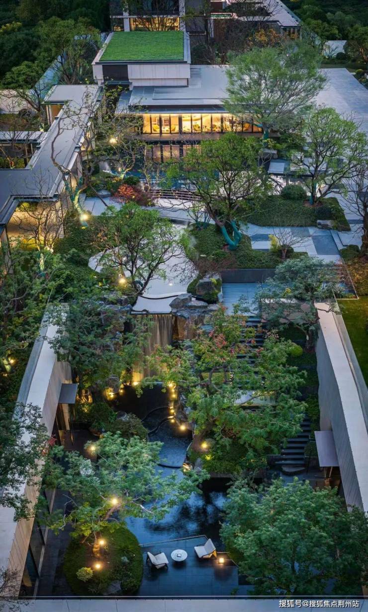 更惊艳的是,九庐还打造了“三重叠水”,约6米高差瀑布,潺潺流下,非常震撼,飞瀑两侧是近200吨山西黑天然石材,瀑布上游设计一片约500㎡的镜面水景,影随景动,让人一眼沦陷。