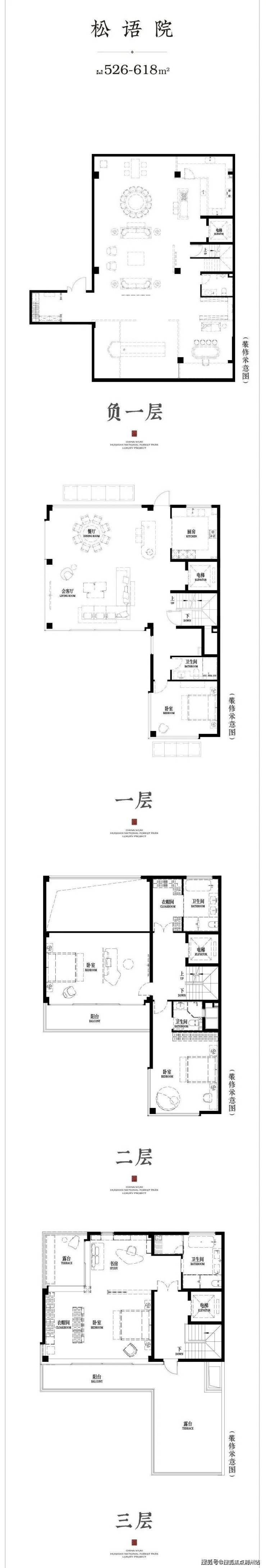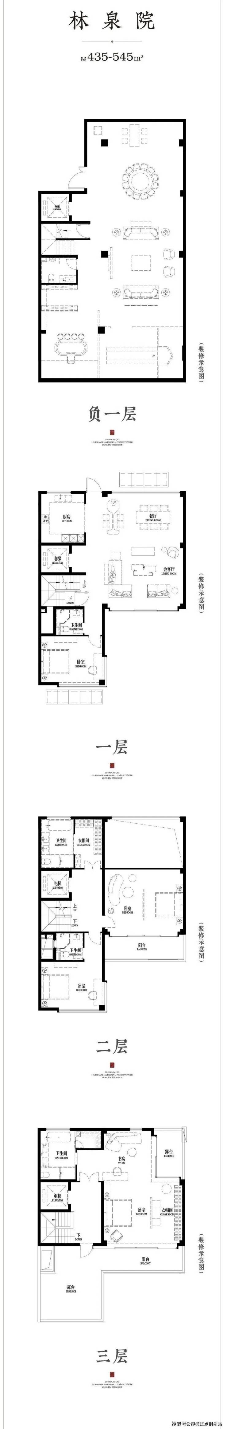 该户型为隐山建面约435-545㎡合院户型,仅15套,位于中轴线位置。户型层高约3.5米,地上三层,地下一层。