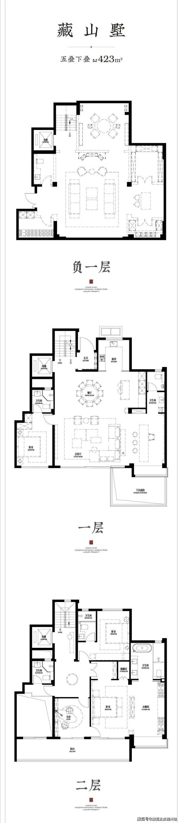 该户型为隐山五叠的下叠户型,建面约423㎡,开间约13.25米,全套房设计,层高约3.3米。