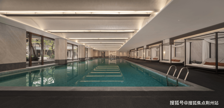 全落地大窗将水光与天光无限收入室内,置身泳池仿若置身山林里的湖泊……