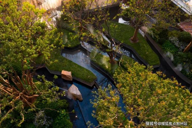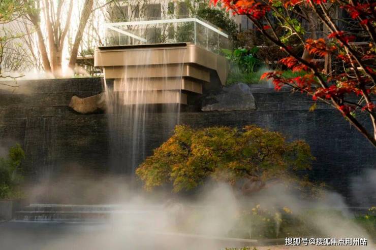 光谷壹号院借山景、引水势,依托自然山地高差、采用600吨天然石材,打造了“园林不见砖”的台地景观;于武汉首创超40米长的安哥拉黑石材瀑布群,并引入西班牙油橄榄、羽毛枫等植被群落,让业主的生活与自然相融、共生。