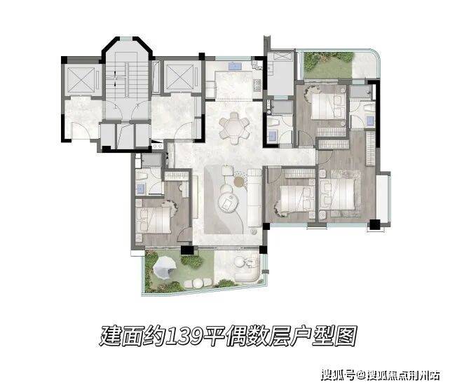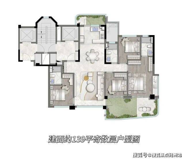 建筑面积约139㎡的四代宅户型,将改善居住提升至新境界。约14.3米面宽可实现餐客厅一体化与南向双套卧,契合多代家庭居住模式。