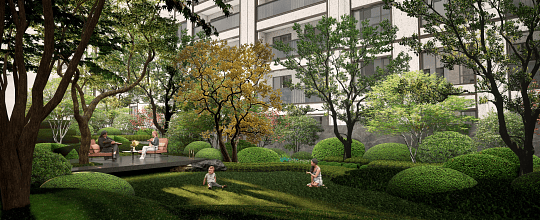 园林设计:以“一轴两带六园”为蓝本,打造3.8米高鸣樾廊桥、5米高林岚水瀑等景观,四季皆景。