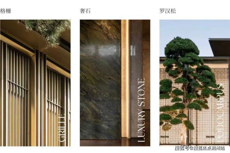 约60米全画幅门庭豁然展开,纳千年风雅于一境。两株超百岁树龄的罗汉松,跨越千里而来,静守世家门楣。金属格栅与天然奢石交织,光影流动间,勾勒出一幅现代东方的诗意长卷——天造一半,人造一半。门庭之上,良渚玉琮纹样化作迎宾重檐,西湖水韵幻为龙鳞叠水。东方符号融入现代构造,诠释世家气度与文化底蕴。