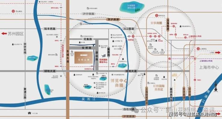 【沪苏主轴 交通主场】扼守沪苏交通脉搏,地铁11号线花桥博览中心站4号口,出站即入家园,3站直达上海。三横三纵立体交通路网,驭享城际生活。