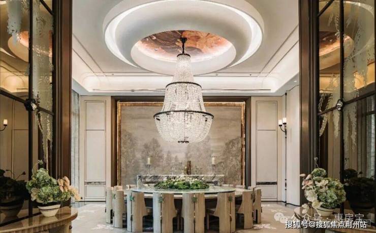 在景观落地窗环绕中,私宴厅以“花廊序列,美学对景”构筑专属的私谧空间,巨型水晶吊灯与浅色饰面的搭配,色彩质感上相得益彰,营造融合艺术、文化与生活美学的奢享感场域,成就令人神往的优雅社交范式。