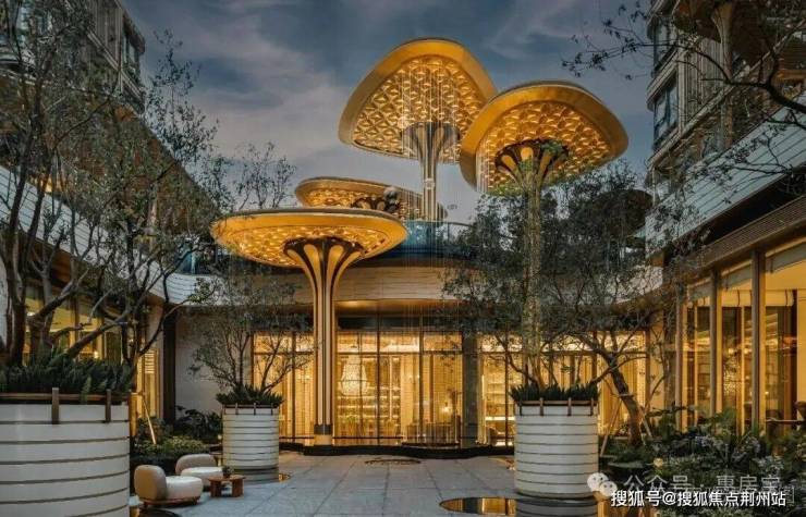 以雅艺柔美的对称主义构筑社区入口大门,从森林中获取灵感,宏观提取叶脉形态,呈现犹如自然中的脉络与流动;同时深入微观的细胞视角,复刻植物的几何纹理与结构逻辑,以自然的秩序与美学塑造“花瓣状的母题造型”。