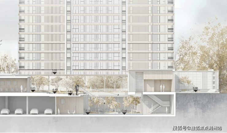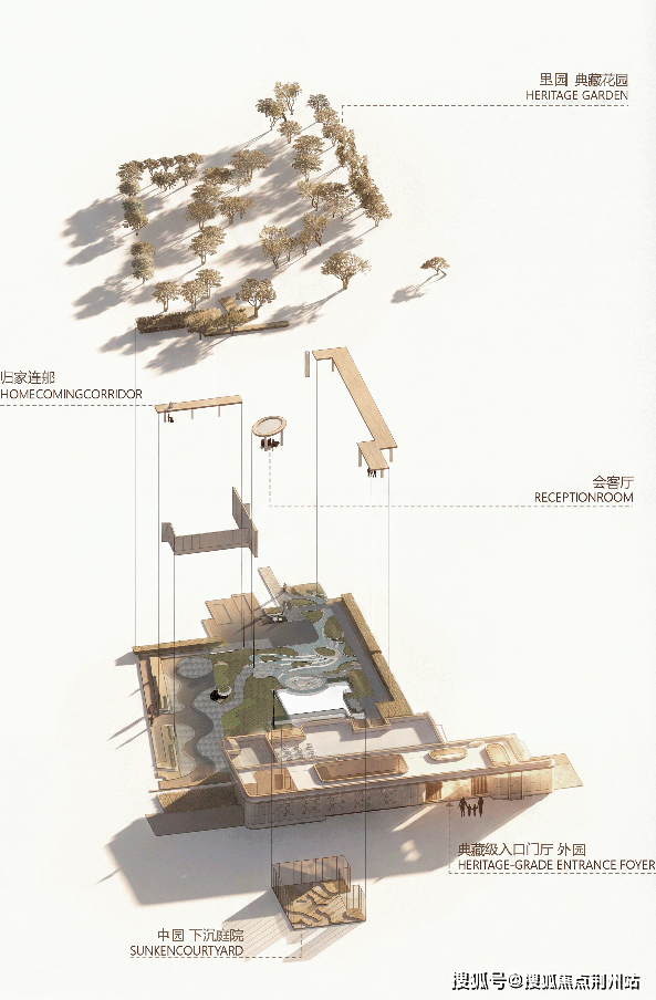 项目毗邻昙华林人文商圈,坐拥多座生态公园,既与高知为邻,亦与同自然共生。场地天赋优雅,积淀出从容深厚的底蕴。为呼应这份独特的气质,项目以“藏园”为精神内核,承袭传统叠山理水、以画入园的智慧,依托场地高差构建立体园林画卷,打造“外园-中园-里园”三重境域。每一重园景皆以艺术级审美雕琢:从门庭的恢弘序章,到下沉庭院再到浮岛水院的静谧倒影,自然溪涧、四时光影皆被凝练为可游可居的日常风景。这不仅是园林的形制营造,更是一部“自然与人文共生的立体画册”。于此,我们以艺术审美与人文体验为核心,将传统居住智慧转化为当代奢居语言,在城市中心缔造出一处兼具隐逸诗意与高端体验的“新奢艺术住区。