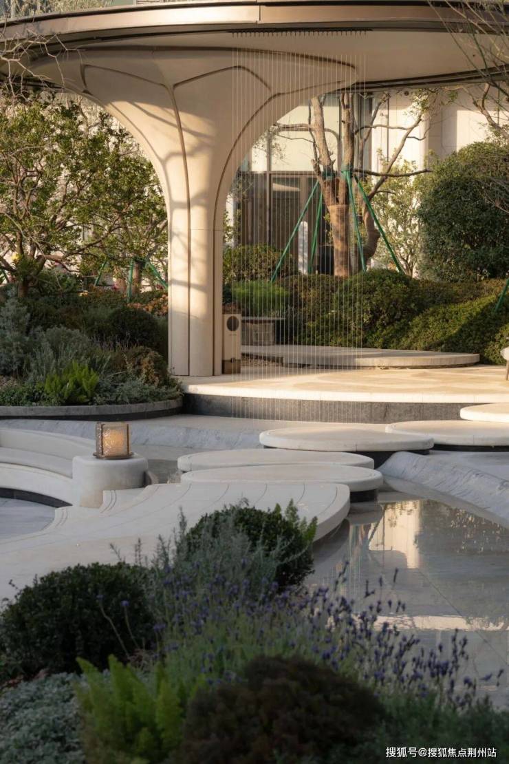 穿过连廊步入后场水院,弧线从容延展,树影轻落池中,汀步如琴键般点缀水面,引向下沉式的静谧休憩处。