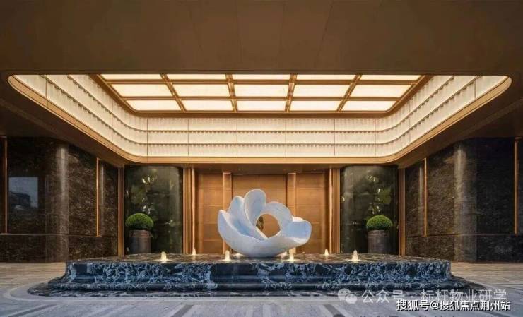 步入大门云石穹顶之下,匠心复刻古代“藻井”神韵,以522片皇家白玉精雕细琢,汇聚光华,辉映古今。华光流溢处,中心池水托举艺术雕塑,莹润皎洁,宛若稀世珍宝。立面更以铂金钻奢石铺陈,搭配墨绿荷塘月色奢石、安哥拉黑奢石花钵,以及手工锻造的巨幅铜门,于光影交错间流淌温润质感,尽显奢华风范。