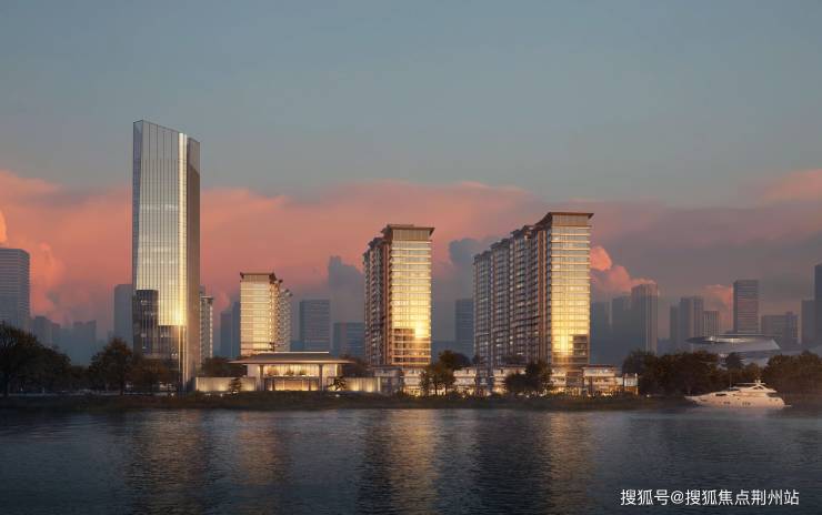建筑立面以观澜屏玻璃立面辉映江水波澜与天际浩瀚,香槟金格栅是鎏金显贵,黄金缕线条流畅灵动,新中式韵律之美点缀CBD天际线。