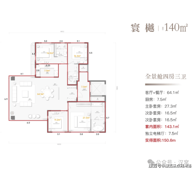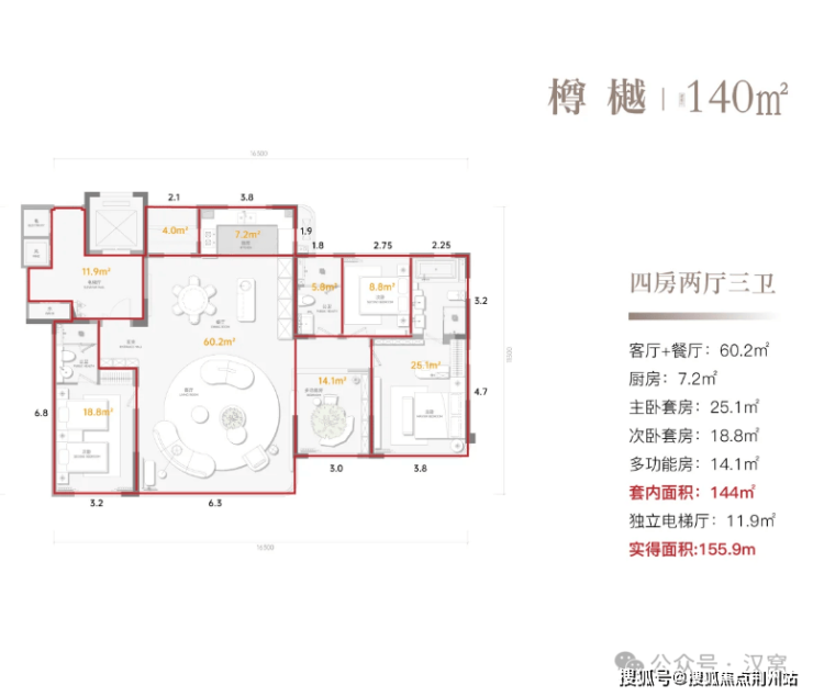 建面约140平,实得面积约155平,得房率约110%。