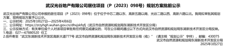 2025年3月27日,武汉光谷地产有限公司居住项目(P(2023)098号)规划方案批前公示,即光谷金融港板块又添一四代住宅。