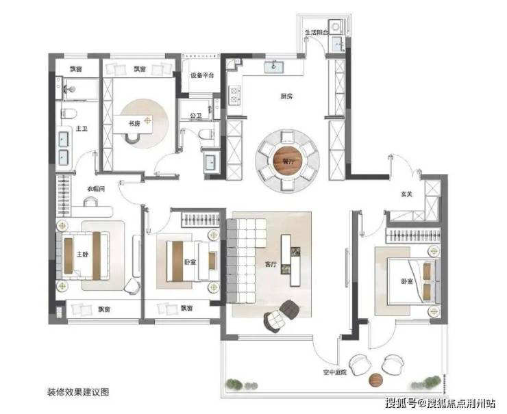主卧套房,双衣帽间,三面采光;南向双开间阳台;双套房次卧;