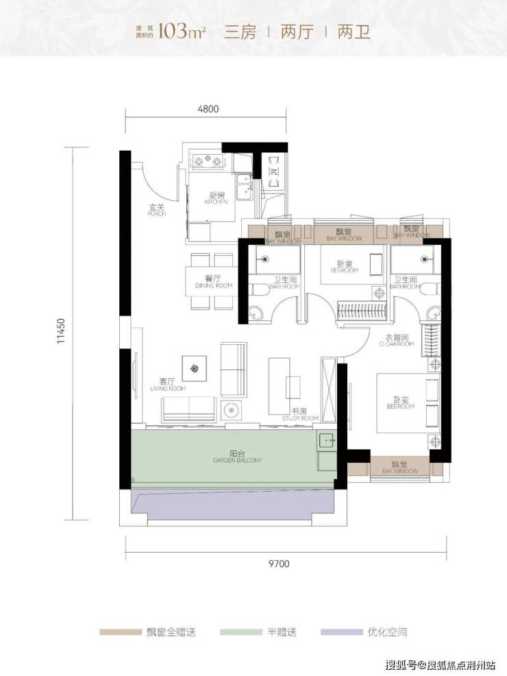 中间户建面103㎡,通过花池+飘窗的赠送,整体赠送面积18.87平,得房率超过90%