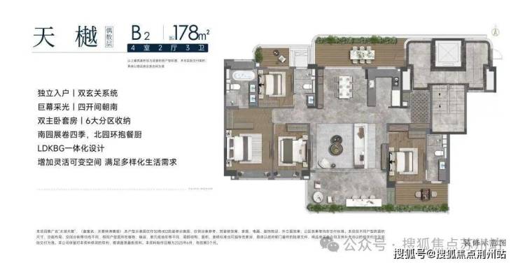 洋房B2户型建面约178㎡,4房2厅3卫,四开间朝南,拥有巨幕采光,南园展卷四季,北园环抱餐厨。
