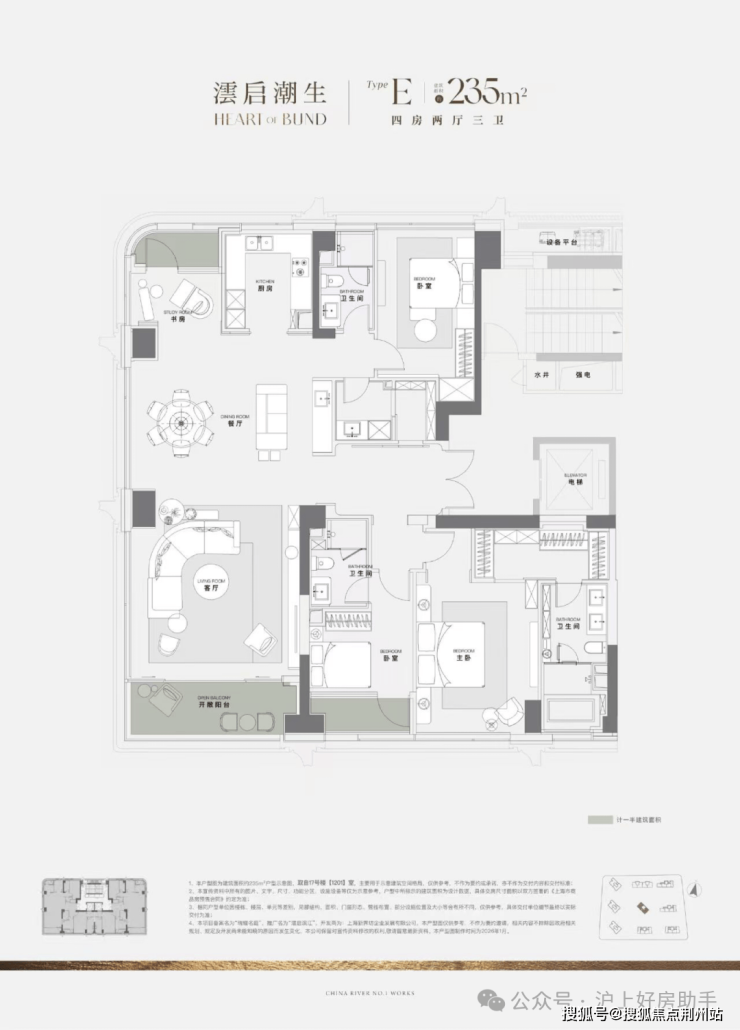 本次推出的235㎡户型是中心楼王的西边套。这个户型既有江景、又被社区中心景观环绕;既远离道路规避噪音、又直面下沉会所享受便利;而且还是全景舱全边套端厅看江户型。