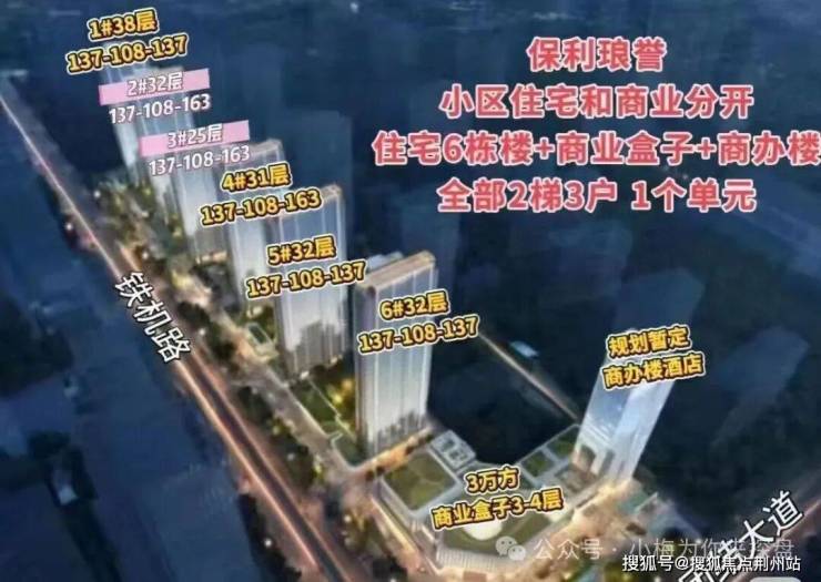 保利琅誉即保利城四期一共6栋房子分为AB两个区—-B区北片项目,共四栋住宅楼,其中1#38F,2#32F,3#25F,4#31F,2、3、4#都有架空层。保利琅誉一共360户,车位配比1:1.09。A区南片有2栋 住宅和商业5#32F和6#32F