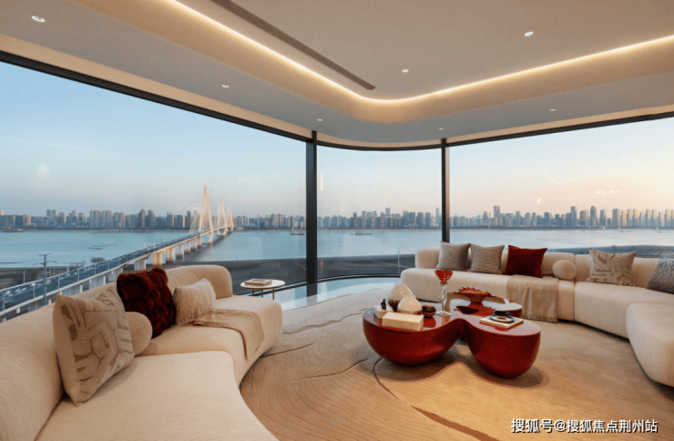 ②约95平一体化巨厅:这是推窗见江的最佳载体之一,巨幕全景落地窗相当霸气。如此奢阔的空间堪比一套三房两厅的小户型,这里包含了阔气餐厅、中西双厨、休闲品茶以及社交主场,商务待客、以江会友,视觉盛宴与商务牌面全都有了。