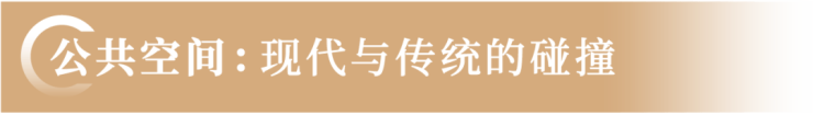 项目住宅片区以“汉口风华·鎏金繁花”为主题,在元素上提取民国时期建筑中拱门造型、圆形窗框、拼花铺装等“方中见圆”的线条元素,运用到景墙、屏风、风雨连廊以及地面铺装上,对话老汉口建筑美学。