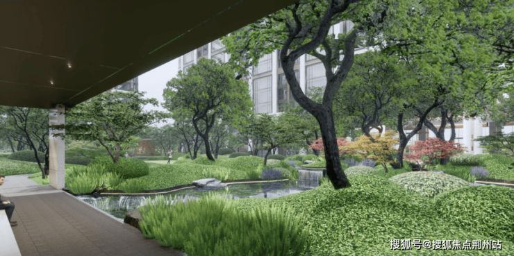 十花园其一:【水岸花厅】中心水院空间“聚水为财,流水生财”,中心庭院巧妙运用“以小见大,一步一景”的设计手法,以叠水布局,利用树木、花境、喷泉、构筑等元素,搭配组合出相映成趣的视觉效果,营造松弛雅致的水苑客厅。