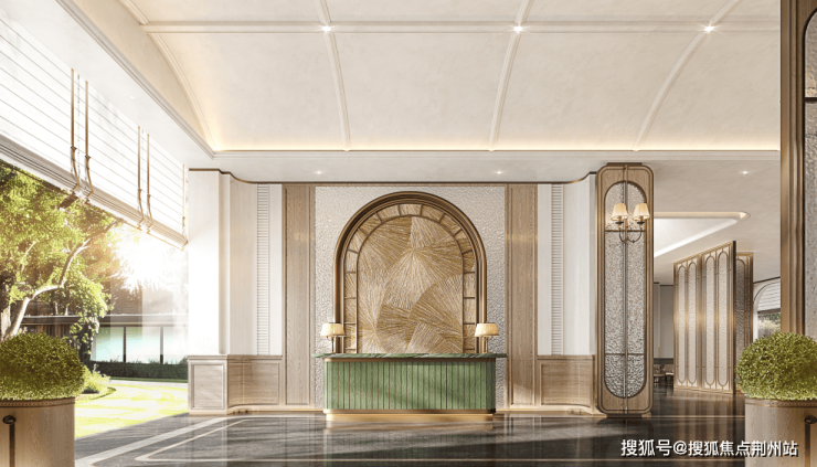 邻里中心接待前厅以芬迪绿色接待台和华美的背景墙为序幕。步入全龄共享的邻里中心,宽敞明亮的大堂空间采用温暖的米白色与金色为主调,与绿色接待台形成和谐而高贵的配色方案,巧妙融合现代设计语言与传统人文情怀。