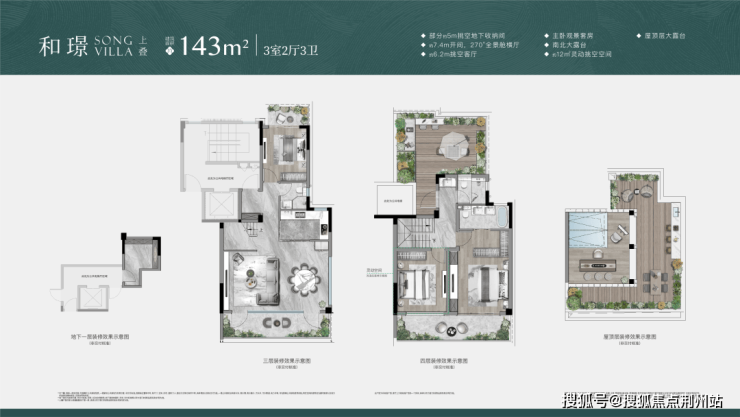 上叠143m²户型3房2厅3卫,赠送客厅挑高、南北双露台及星空屋顶大露台,轻盈而通透。