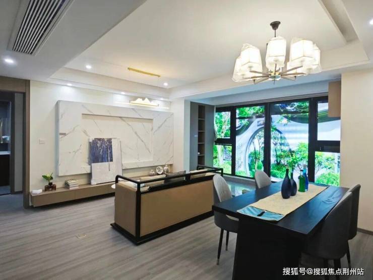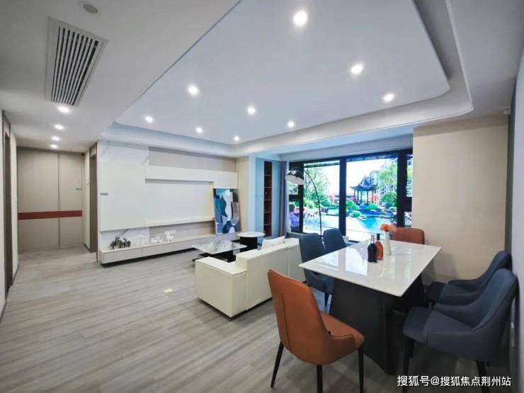 样板间日立中央空调、海信新风系统都在交付标准内,客厅空调出风口长条状设计,造型简洁,线条流畅。