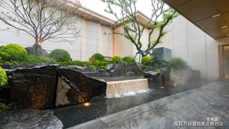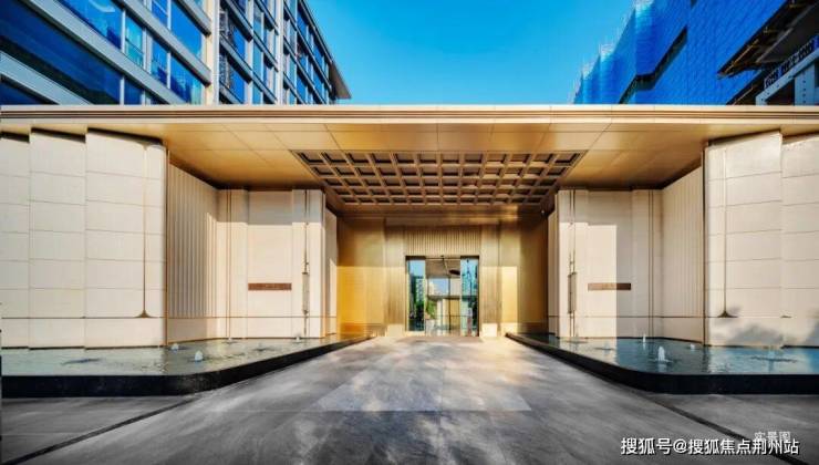 最为引人注目的,是那幅以山东博物馆镇馆之宝“九旒冕”为灵感打造的10米高巨幅金属水幕 。水流沿金属垂帘缓缓而下,并非磅礴激烈,而是在阳光映照下,闪烁着细碎的光芒,宛如珠帘摇曳,发出轻柔悦耳的声响,在归家动线上铺陈开一幅流动的东方画卷。