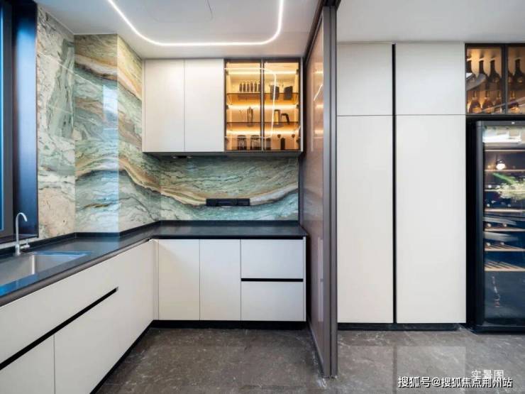 厨房墙面甚至罕见地使用了与客厅同款的“青山远黛”奢石,每一处选材都经得起细细品味。据房老师儿了解,云顶·嘉元是目前市场上唯一在厨房墙面使用奢石交付的项目。